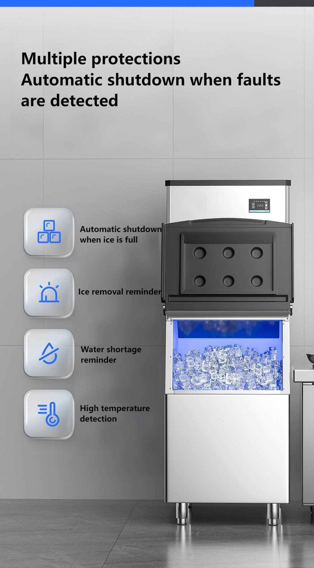 Equip with an independent water inlet and drain pipe, ensure proper floor drainage, and regularly clean the water collection tank. Wipe the machine surface to keep the ice outlet clean.